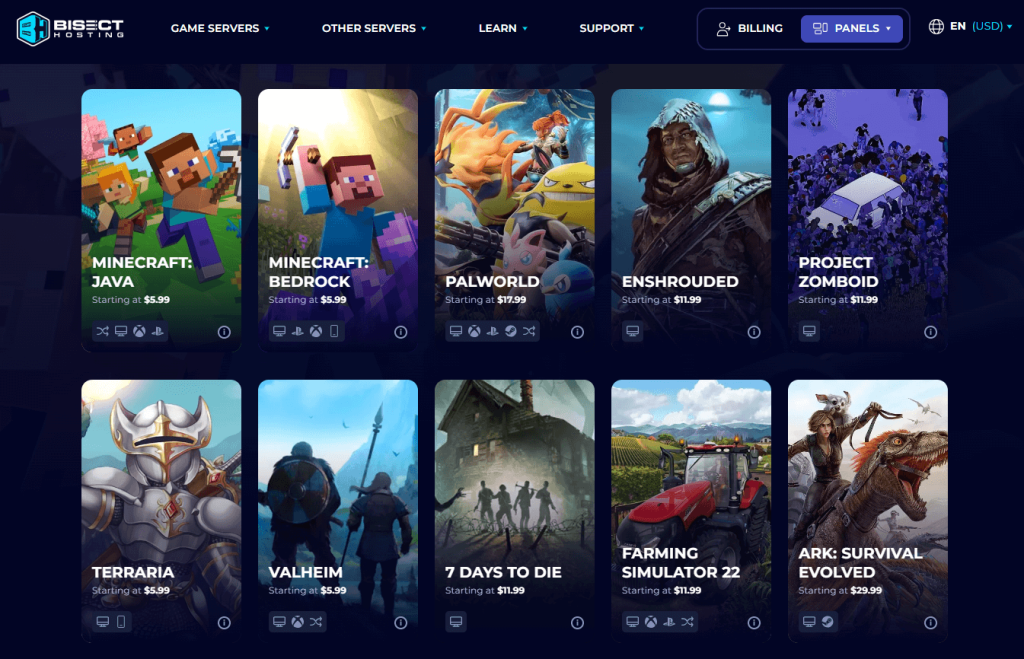 BisectHosting is a popular game server hosting provider best known for Minecraft hosting, but it also supports a large catalog of other games such as Valheim, Rust, ARK: Survival Evolved, Project Zomboid, Terraria, Satisfactory, and many more.