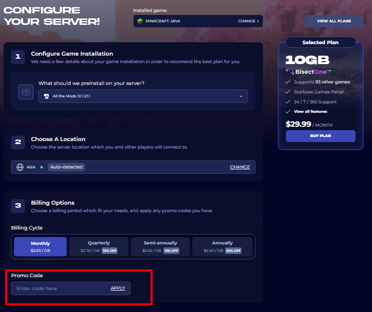 Paste the exclusive BisectHosting Promo Code into the promo code field and click Apply.