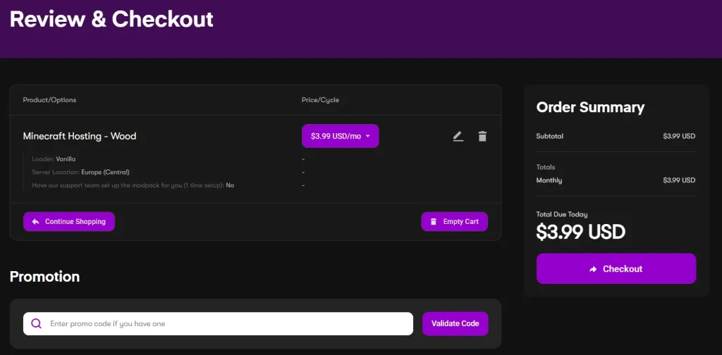 Before checkout, you can add mods, plugins, or extra storage. These options enhance gameplay and can still be discounted with a valid promo code.