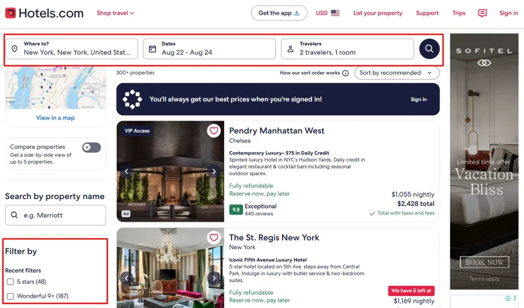 You can narrow down the results by using filters. For example, you can sort by price, star rating, guest reviews, amenities like Wi-Fi or breakfast, or even choose family- or pet-friendly hotels.