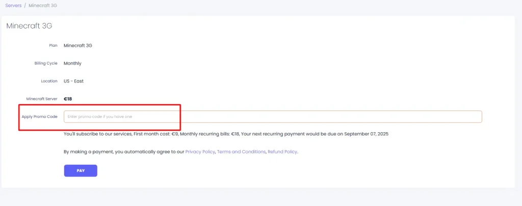 Enter your payment details (like your card or PayPal), and finish the payment. Your game server is now ready, and you’ve saved money!