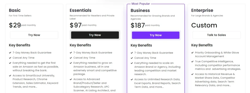 Click on the Pricing page at the top menu. SmartScout has four plans: Basic, Essentials, Business, and Enterprise. Look at the features of each plan and pick the one that fits your needs. Then click the Try Now button.