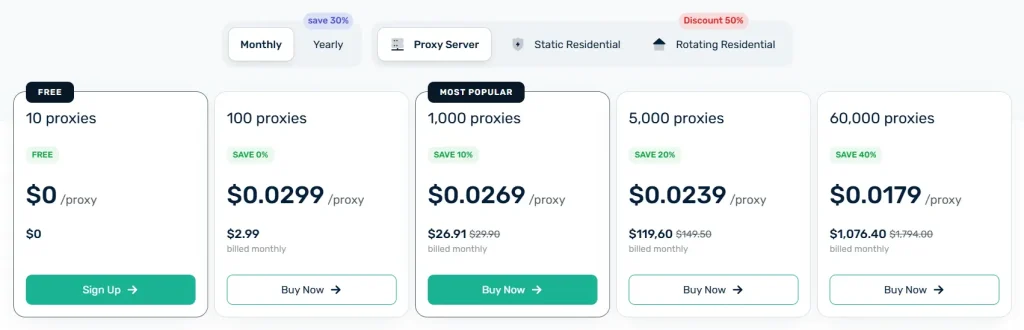 Browse through Webshare’s pricing options. They offer datacenter proxies, ISP proxies, and residential proxies. Select the plan that fits your needs, whether it’s for data scraping, market research, or account automation.